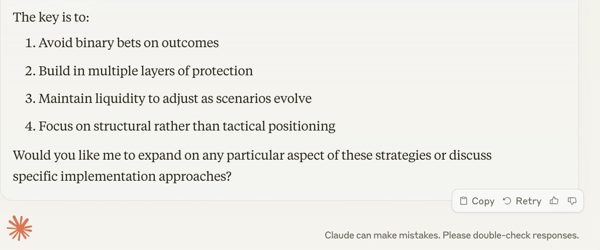Claude did its best impersonation of a skilled litigator in front of an unknown jury. No specific investment tips here. Instead, Claude offered a framework for thinking about the problem. It’s like teaching someone to fish instead of handing them one, assuming the fish could lose all your money.